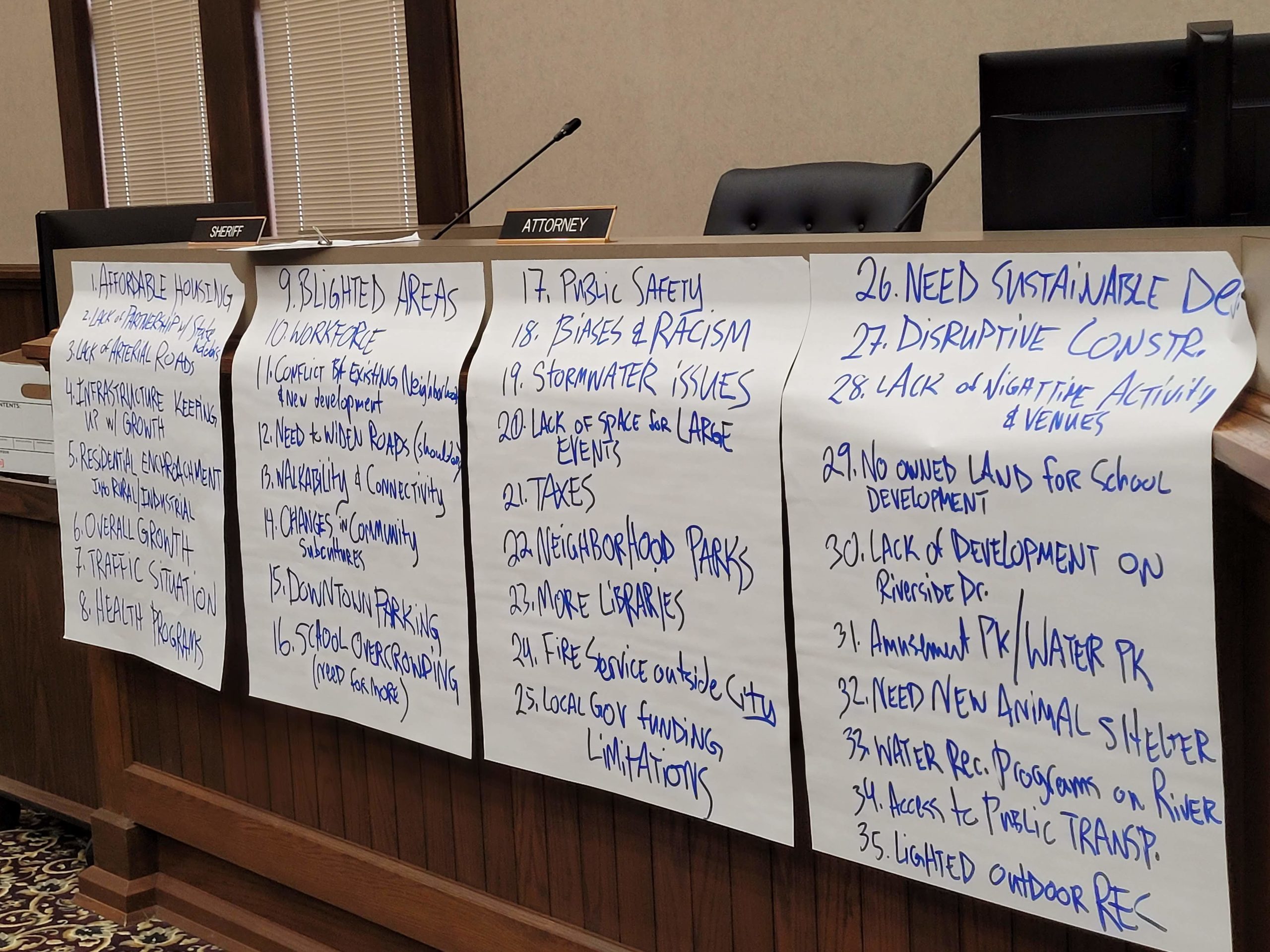 Over the course of three days, CMCRPC staff and Houseal Lavigne met with more than 100 people including elected and appointed officials, City and County department heads, the citizen committee, and eleven focus groups, to identify the issues and concerns faced by the community and to discuss its greatest strengths and assets. Click the link below for a detailed summary of public input from these workshops
