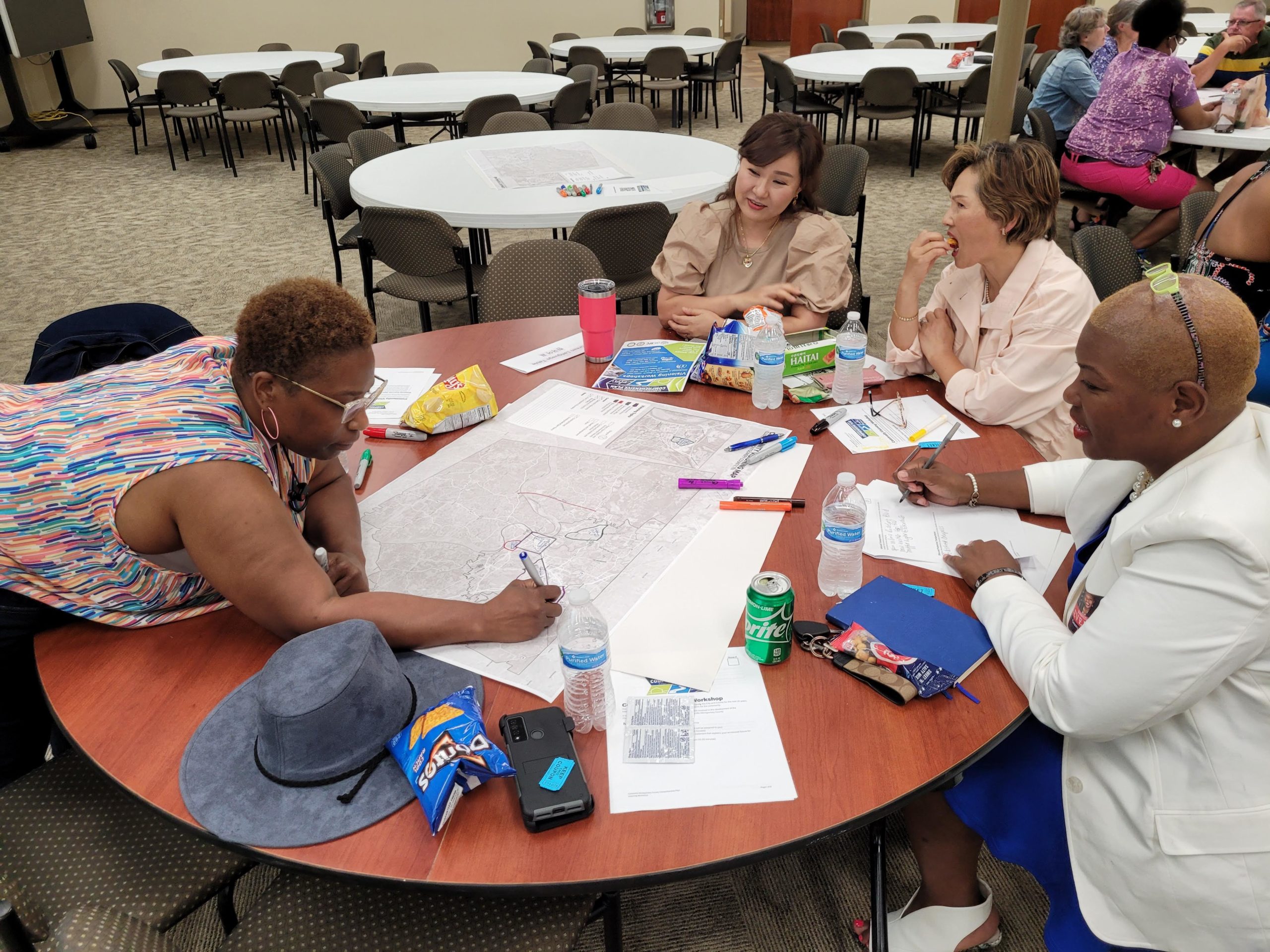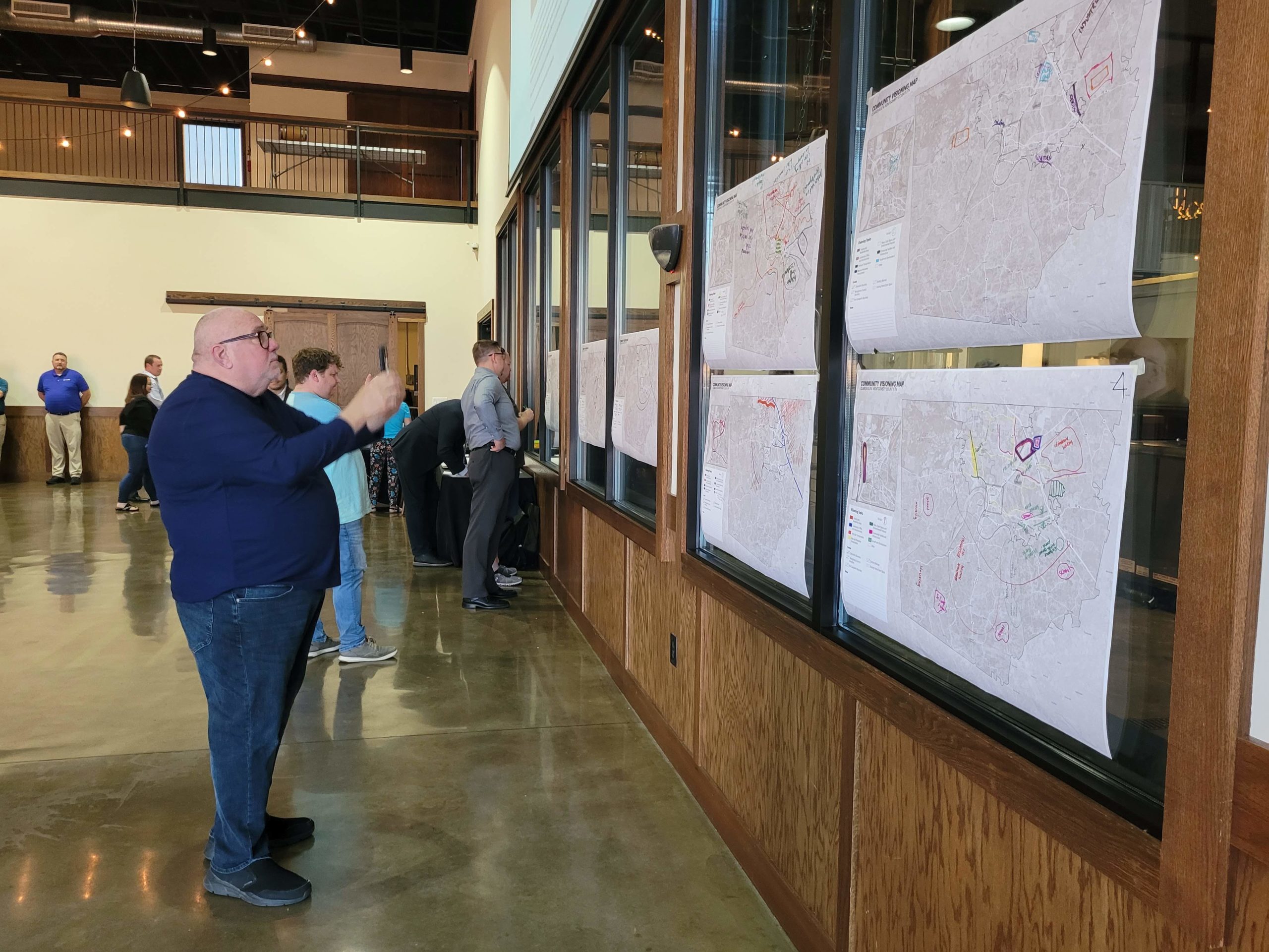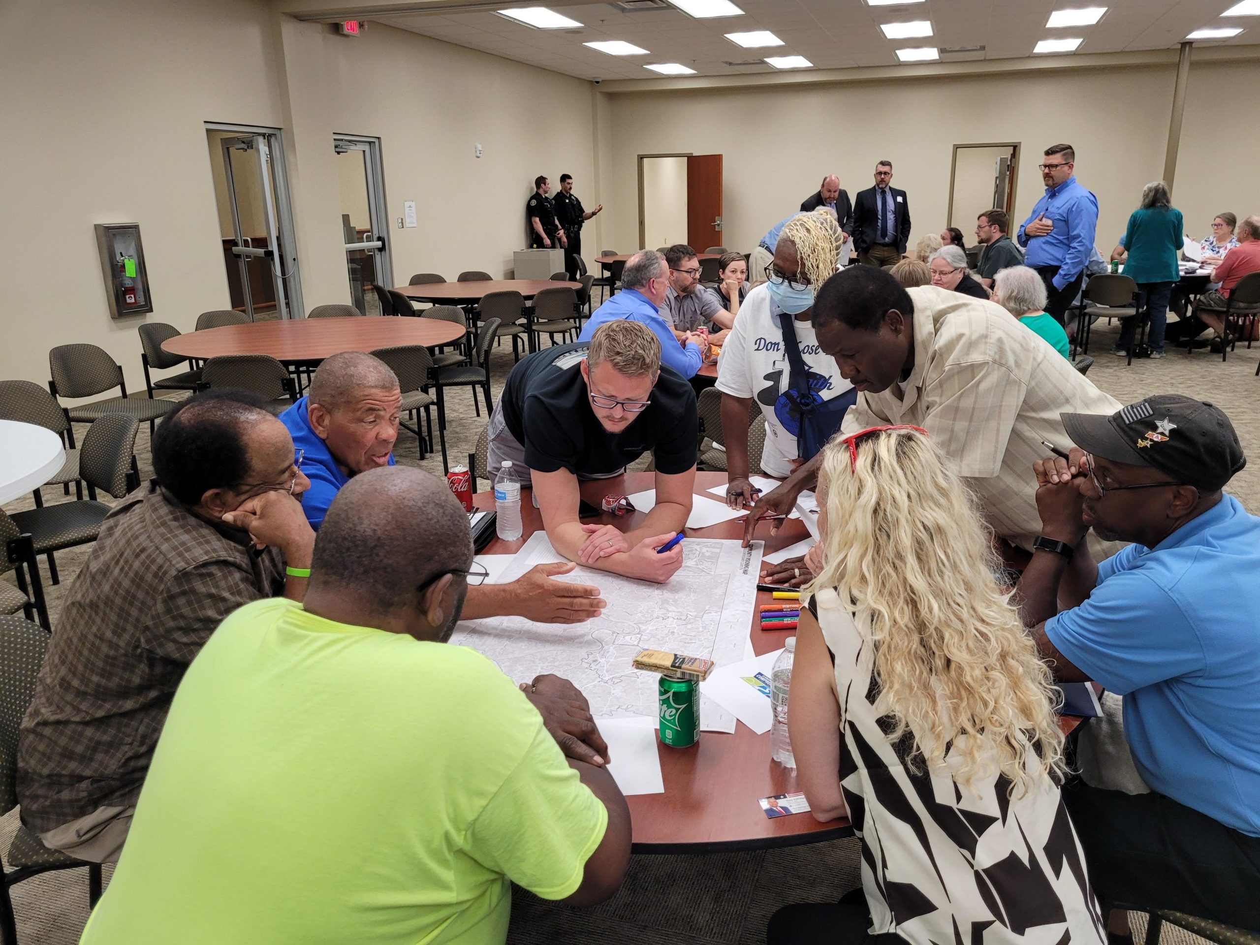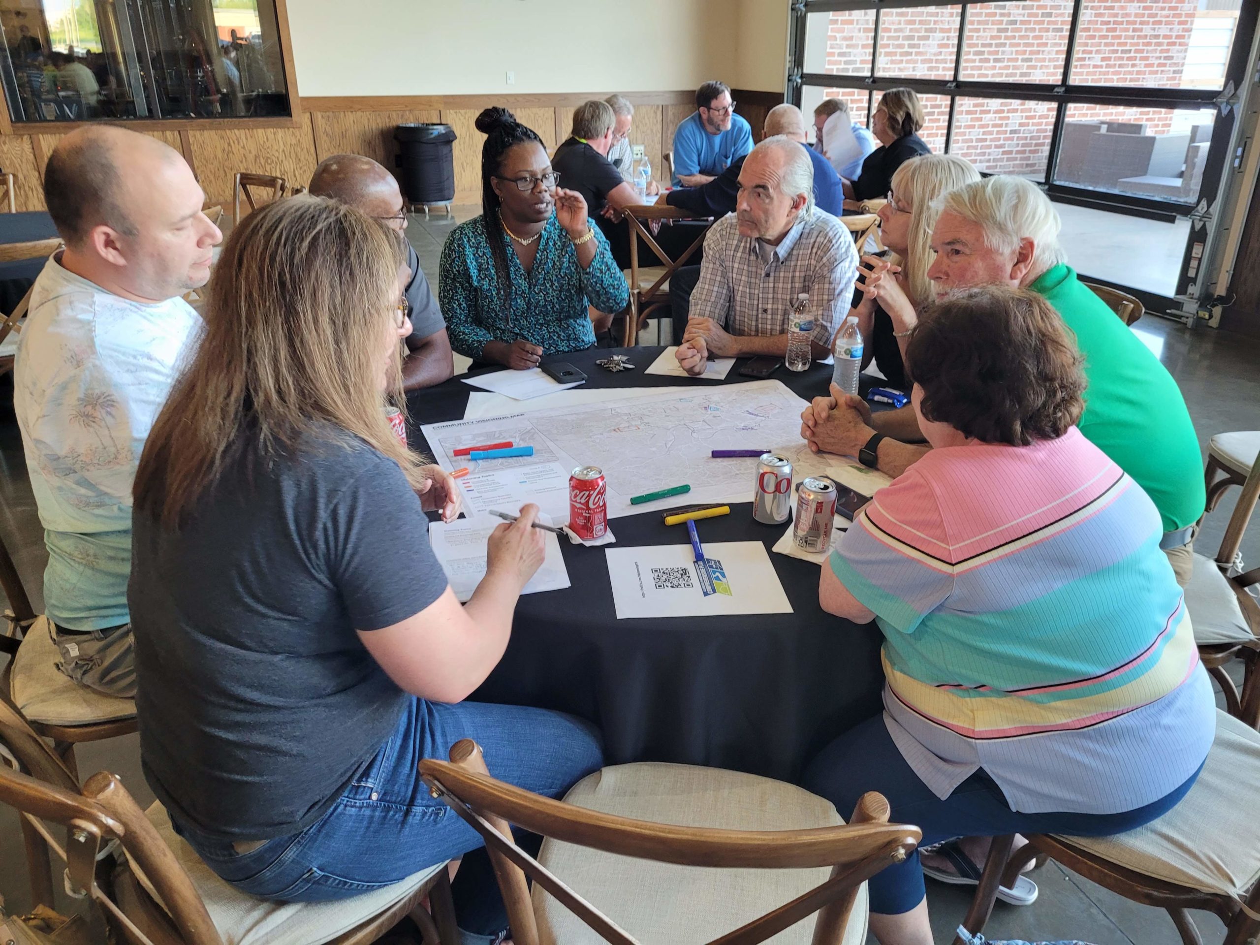 One of the most important aspects of the comprehensive plan is gathering the community’s visions, goals, and values. This can be done in several ways (one way was our use of the online survey) including in-person workshops. We welcomed over 170 participants to one of three workshops in July to meet with other residents and discuss issues in the community. One key take away was the use of maps to draw on and notate the issues discussed in the groups.