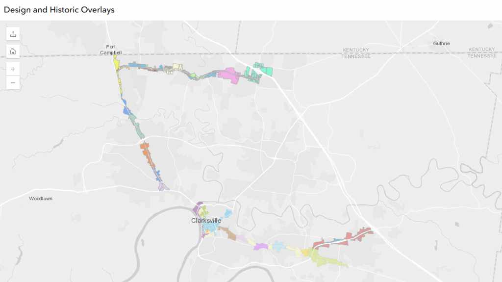 A map showing Clarksville’s Design and Historic overlay districts.